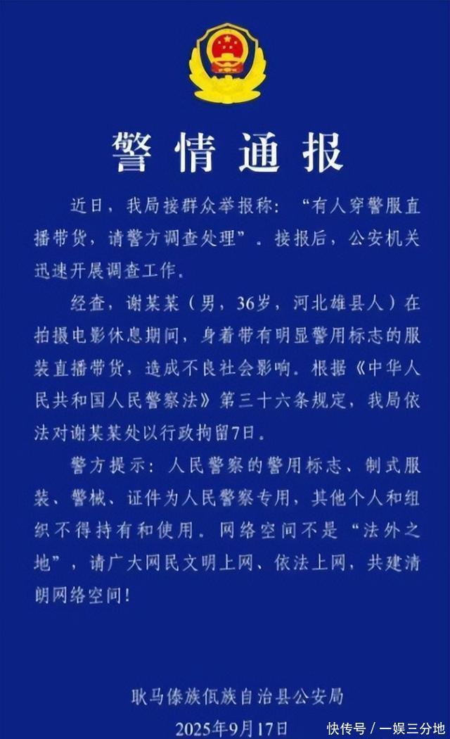 在阅读此文之前,辛苦您点击一下“关注”,既方便您进行讨论和分享,又能给您带来不一样的参与感,感谢您的支持! 文丨 冷心 编辑丨 冷心 最近,演员谢孟伟因为直播带货惹上麻烦了,他穿着警服在直播间里卖东西。 被人质疑后还嘴硬,说是拍省厅大戏用的道具,结果立马就被警察抓走关了七天。